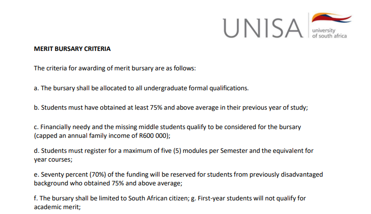 There are other Unisa bursaries such as Unisa Merit bursary. Students who received the bursary in the current year do not need to apply. Such students must, however, meet the 75% average to be considered for the bursary in the next academic year.