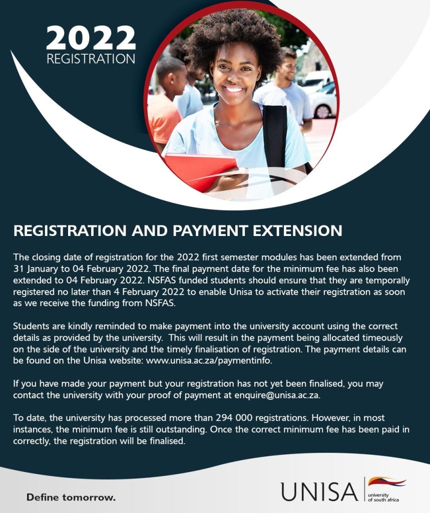 The closing date of registration for the 2022 first semester modules has been extended from 31 January to 04 February 2022. The final payment date for the minimum fee has also been extended to 04 February 2022.